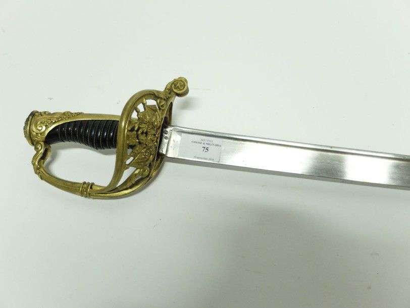 Sabre d'Officier des Chasseurs de Vincennes, modèle 1838. Poignée en corne, avec filigrane. Monture en laiton ciselé. Calotte à longue queue. Garde à une branche, à coquille ajourée à décor de feuilles de chêne et laurier, sur faisceau de drapeaux. Lame courbe, à dos baguette. Fourreau à deux bracelets en fer. ABE (fourreau piqué)