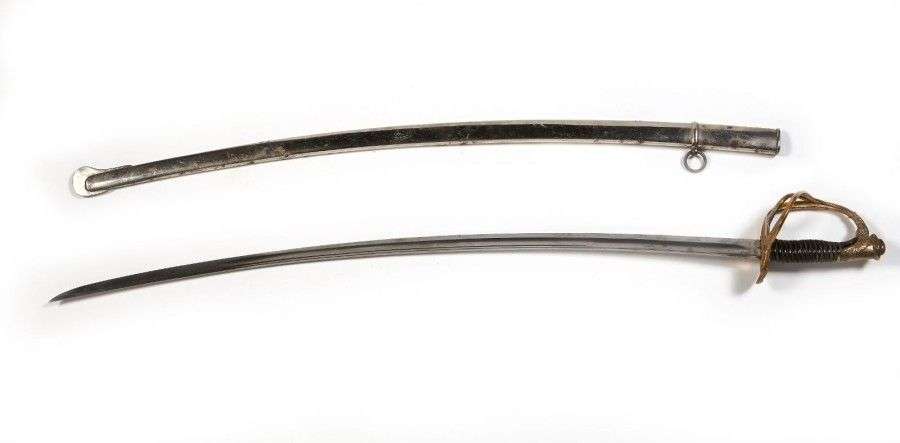 Sabre d'Officier de Cavalerie légère, modèle 1822-82. Poignée en corne, avec filigrane. Monture en laiton ciselé. Calotte à courte queue. Garde à trois branches. Lame courbe, à dos rond, pans creux et gouttières. Fourreau à un bracelet en métal nickelé. ABE (oxydation au fourreau).