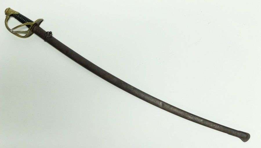 Sabre d'Officier de Cavalerie, modèle 1822-82. Poignée en corne. Monture en laiton ciselé. Calotte à courte queue. Garde à trois branches. Lame courbe, à dos rond avec marquage, pans creux et gouttière. Fourreau à un bracelet en fer. ABE (manque le filigrane, piqûre au fourreau)