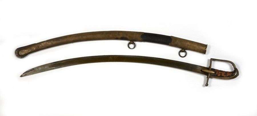 Sabre de Hussard Révolutionnaire. Poignée recouverte de basane. Monture en laiton poinçonné. Calotte à longue queue. Garde à une branche, poinçonnée du faisceau de licteur, coq et « AP », à oreillons en navette. Lame courbe, à dos plat, contre-tranchant et pans creux, gravée du hussard chargeant. Fourreau recouvert de cuir, à deux grandes garnitures en laiton. Anneaux et dard en fer. EM (usures et oxydation)