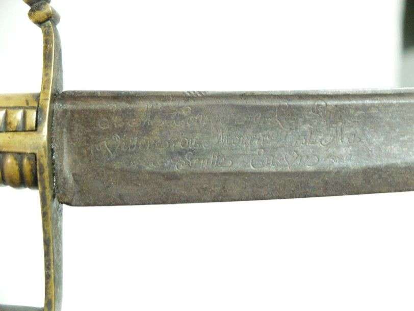 Sabre d'Infanterie, dit briquet, modèle 1767. Monture en laiton. Garde à une branche. Lame courbe, à dos plat, pans creux et gouttière, gravée sur une face « Je Me Consacre à La Patrie Vaincre ou Mourir C'est Ma Seulle En Vie ». EM SF