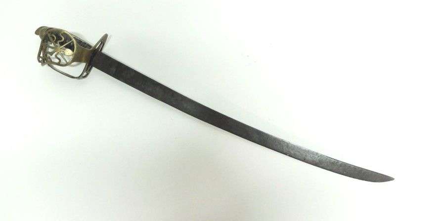 Sabre de Volontaire Révolutionnaire. Poignée recouverte de basane, avec filigrane. Monture en laiton. Calotte à longue queue, surmontée d'un bonnet phrygien. Garde à deux branches, à coquille ajourée à motif aux trois ordres. Lame courbe. EM SF