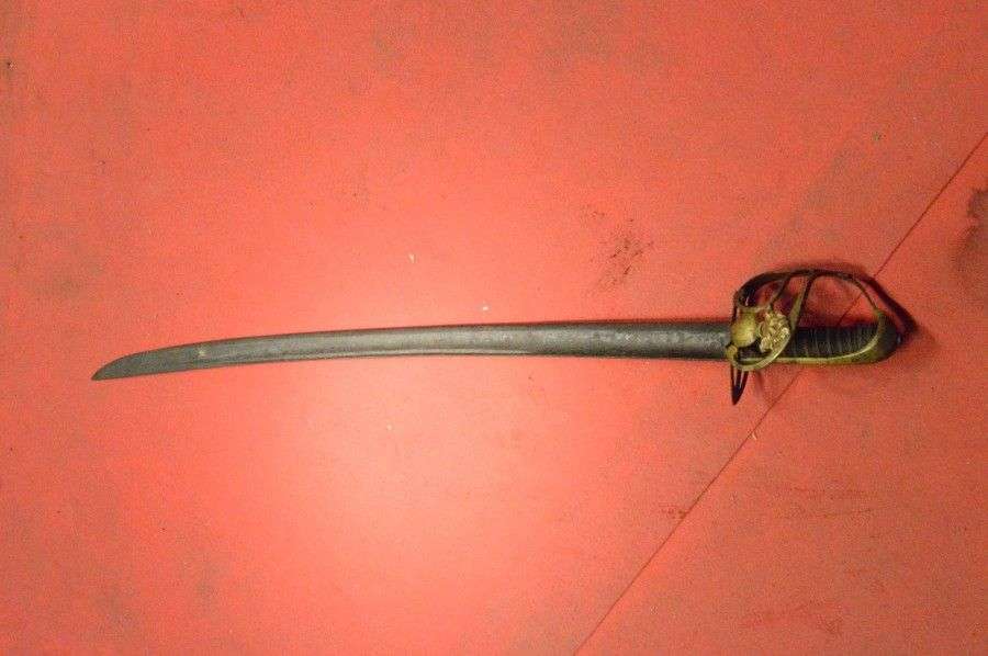 Sabre de Grenadier volontaire Révolutionnaire. Poignée recouverte de basane, avec filigrane. Monture en laiton. Calotte à longue queue. Garde à trois branches, à motif à la grenade. Lame courbe, à dos plat, pans creux et gouttière. EM SF