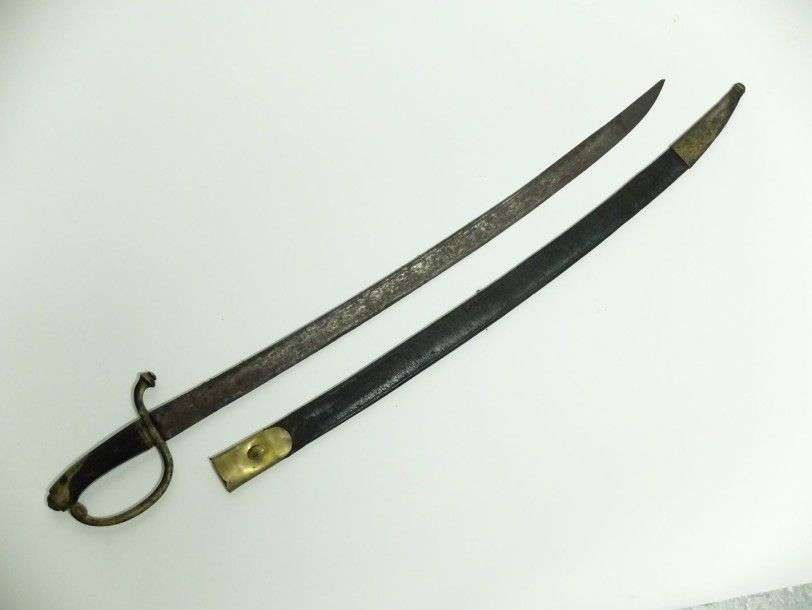 Sabre de Gradé d'Infanterie dit de la Vieille Garde. Poignée en ébène quadrillé. Monture en laiton. Calotte à courte queue. Garde à une branche. Lame courbe, à dos plat et pans creux. Fourreau en cuir, à deux garnitures en laiton. EM
