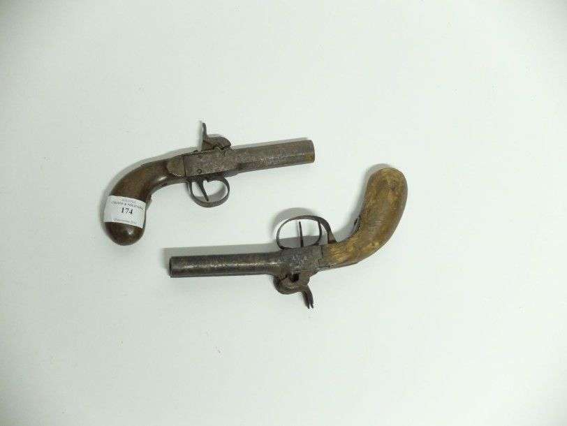 Lot de 2 pistolets, à coffre, à percussion : 1 à double canons | 1 à simple canon. Dans l'état vers 1850