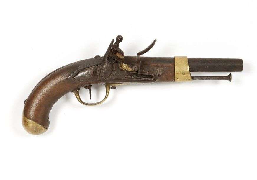 Pistolet d'arçon, modèle An XIII. Canon rond, à pans au tonnerre. Platine
