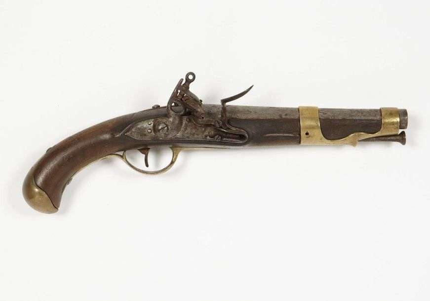 Pistolet d'arçon, modèle 1763-66, fabrication de 1775. Canon rond, à méplats au tonnerre daté 75. Platine marquée « Manufacture de St Étienne », chien à corps rond. Garnitures en laiton. Crosse en noyer avec marquage. Baguette en fer. EM (piqûres, usures)