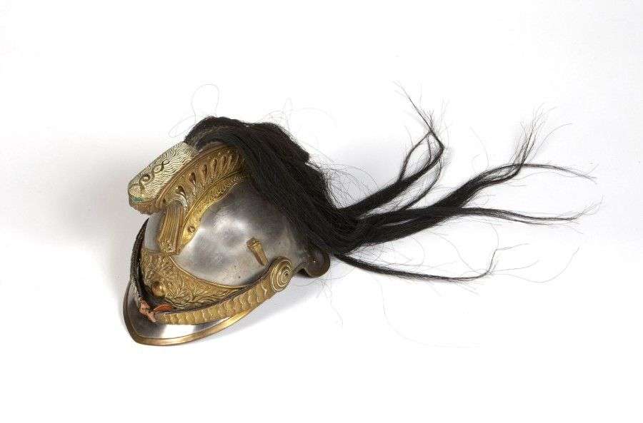 Casque à cimier de Dragon, modèle 1874. Bombe, visière et couvre-nuque en fer. Cimier, plaque et jugulaires à écaille en laiton. Crinière en crin noir. Coiffe intérieure en cuir. ABE (accidents au cuir)
