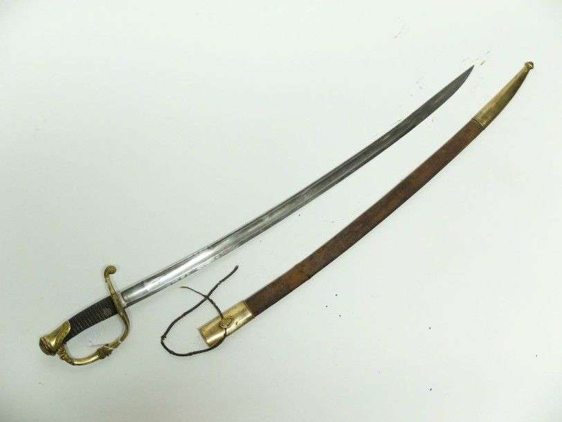 Sabre d'Officier d'Infanterie, modèle 1821. Poignée recouverte de galuchat, avec filigrane. Monture en laiton, ciselé, doré. Calotte à courte queue. Garde à deux branches. Lame courbe, à dos plat daté 1831, pans creux et gouttière. Fourreau en cuir, à deux garnitures en laiton, décoré au trait, doré. ABE époque Louis-Philippe (lame piquée, accident au cuir)