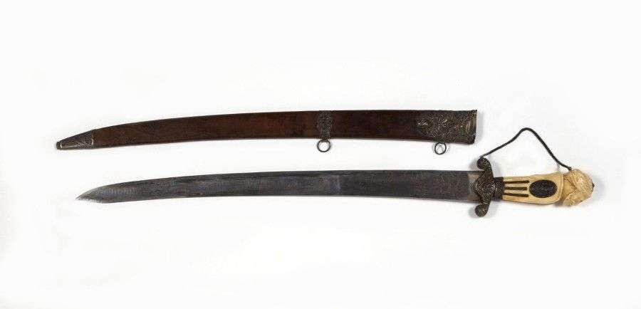 Beau couteau de vénerie. Poignée en ivoire sculpté d'une tête de turc, décoré de médaillons ovales décoré de tête de grotesque et tigelles en argent. Monture en argent à décor repoussé. Garde à chaînette et quillons enroulés. Lame courbe, à dos plat, contre-tranchant et pans creux, gravée d'écritures, soldat turc et attributs militaires. Fourreau en cuir, à trois garnitures en argent, découpé, décoré en suite. Dard en fer. BE époque milieu XVIIIè siècle (lame tachée, petits accidents et réparations à l'argent)
