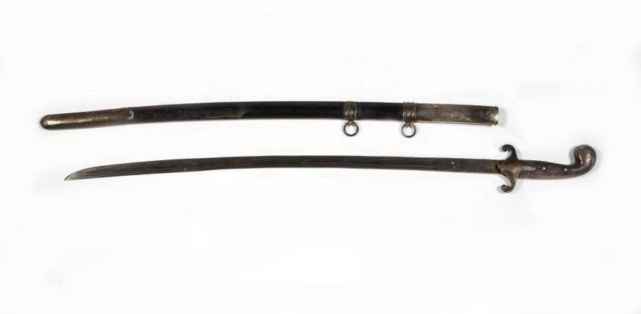 Sabre oriental. Monture en métal argenté, gravé. Poignée en crosse. Garde à deux quillons enroulés. Lame courbe, à dos plat, contre-tranchant, pans creux et gouttière. Fourreau recouvert de cuir, à trois garnitures en métal argenté, gravé. ABE (accidents à la poignée et au bois, cuir postérieur)
