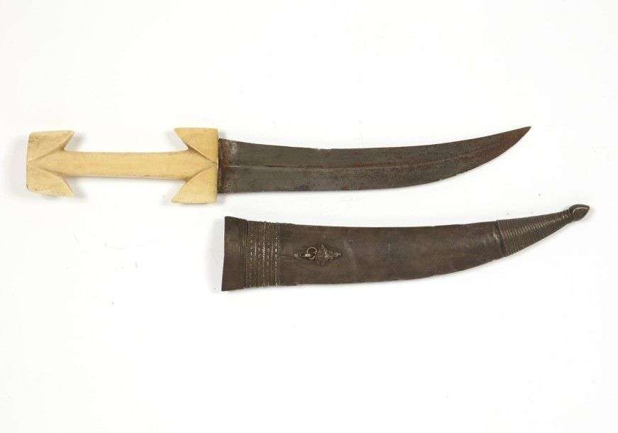 Poignard oriental. Poignée en ivoire de morse. Lame courbe, à deux trancha