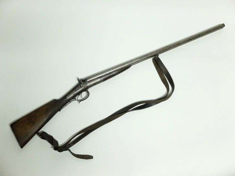 Fusil de chasse, à système George H Dawis, à percussion centrale, chiens extérieurs. 2 coups, calibre 12. Canons juxtaposés, en damas. Bascule et platine gravées de rinceaux. Clef d'ouverture sous le pontet. Pédale de sûreté à la queue de pontet. Crosse en noyer, en partie quadrillé. EM vers 1880 (piqûres, usures)