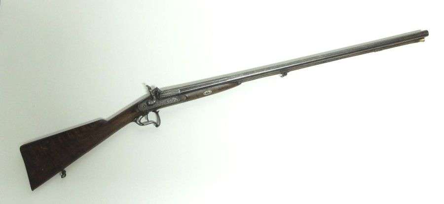 Fusil de chasse double, à percussion. Canons en table, ruban, ronds, à pans au tonnerre. Platines et garnitures gravées. Crosse en noyer. Avec une baguette moderne en bois. ABE vers 1840. (piqûres, fêles au bois)
