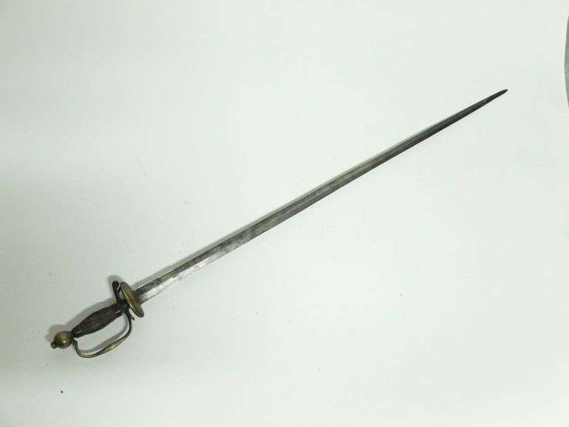 Épée de Bas-officier. Fusée entièrement filigranée. Monture en laiton. Garde à une branche et pas d'âne. Coquille bivalve. Lame à deux tranchants, à arête médiane. EM SF vers 1760 (accidents et manques)