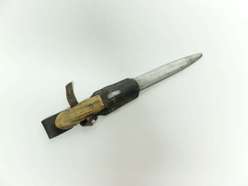 Poignard artisanal. Poignée en bois de cerf. Lame à pan creux et gouttière. Avec un fourreau de baïonnette, en fer et porte fourreau en cuir. On joint un fourreau en cuir de baïonnette. EM