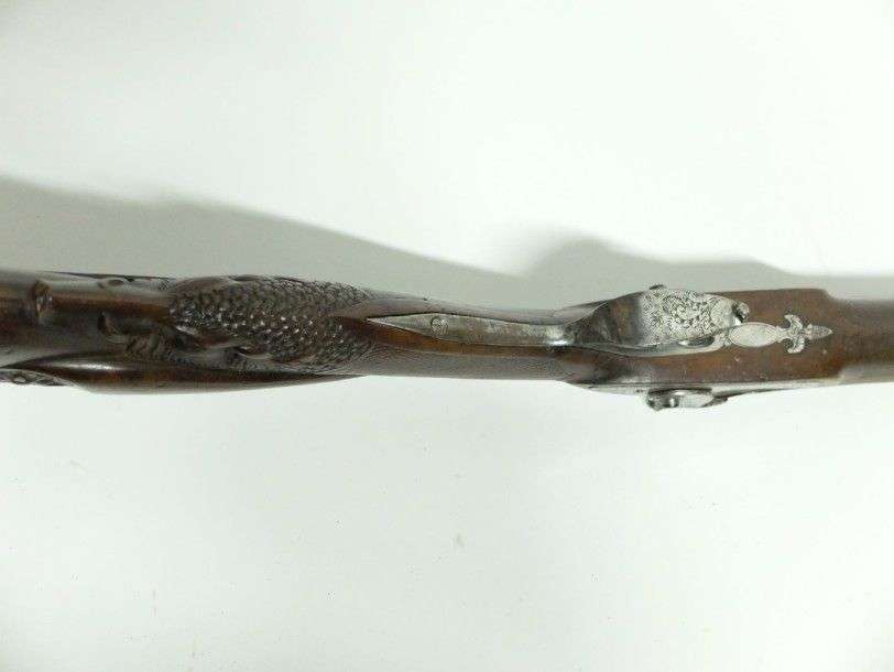 Fusil de chasse, double, à percussion. Canons en tables. Platines avants. Crosse à joue, en noyer, sculpté d'une hure de sanglier. EM vers 1830 (piqûres, cassure au col de crosse)