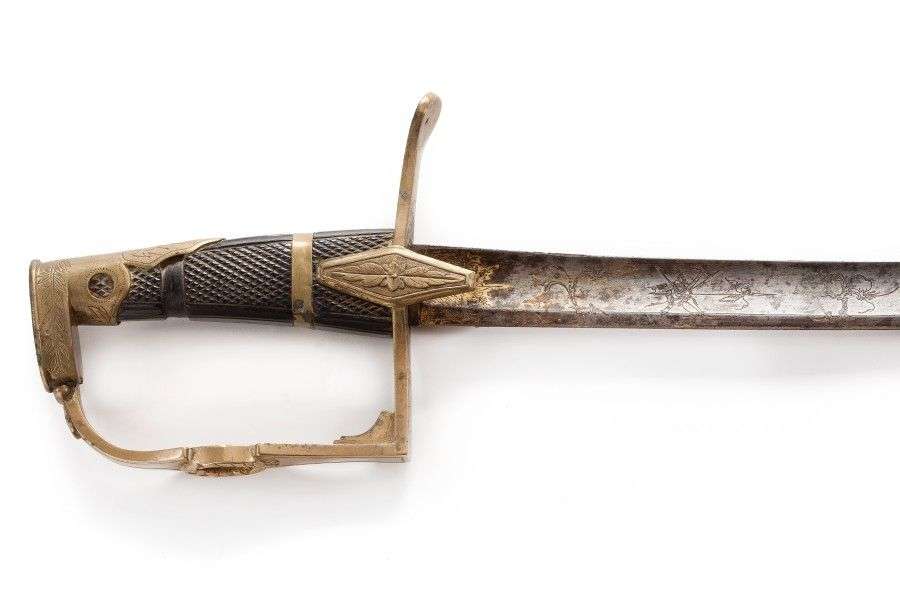 Sabre d'Officier de Cavalerie légère, style Ier Empire. Poignée en bois quadrillé et noirci. Monture en laiton, gravé. Calotte à l'allemande, à courte queue. Garde à une branche, à oreillons à pans. Lame courbe, à dos plat, contre-tranchant et pans creux, gravée au tiers. Fourreau à deux bracelets en laiton, gravé. Dard en fer. ABE (lame piquée)