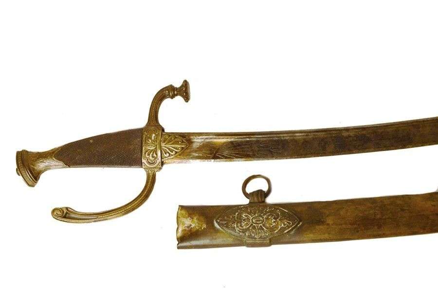 Sabre d'Officier de Cavalerie. Poignée en bois quadrillé. Monture en laiton ciselé. Calotte à courte queue. Garde à une branche et demis oreillons. Lame courbe, à dos baguette et contre-tranchant, gravée au talon. Fourreau en fer, à deux bracelets en laiton ciselé. Dans l'état (accidents, manques)