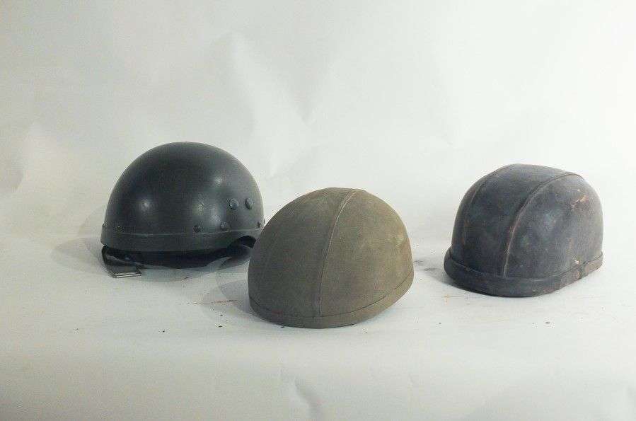 Lot : casque de tankiste en fibre | casque de saut recouvert de toile, casque de motocycliste civil recouvert de cuir.