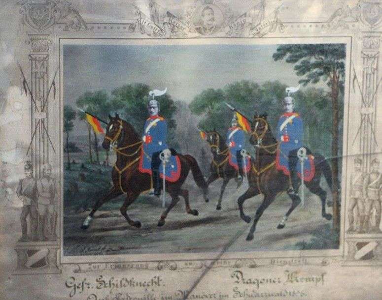 « Gefr Schildknecht Dragoner Kempf » Gravure aquarellée, à têtes en photo