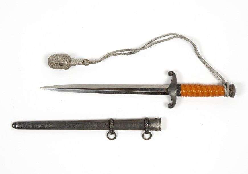 Dague d'Officier de l'Armée de terre, modèle 1935. Fusée orange. Monture et fourreau argentés. Lame à deux tranchants. Dragonne argentée. EM Fabrication Eickhorn.
