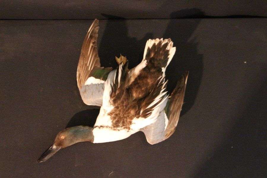 Canard souchet mâle (Anas clypeata) (CH) : spécimen ancien présenté en nature morte, belle pièce décorative