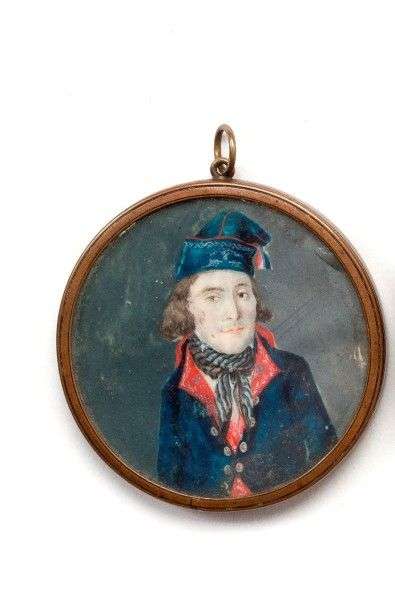 « Artilleur révolutionnaire » Miniature ronde sur ivoire. Sous verre. Cerclage en cuivre. Ø 5,5 cm (cassure au verre du verso)