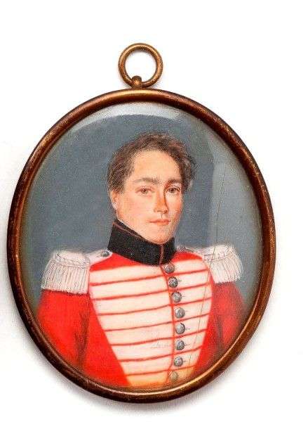 « Officier étranger » vers 1820 Miniature ovale sur ivoire. Sous verre. Cerclage en cuivre. 6,4 x 5,3 cm (fêle)