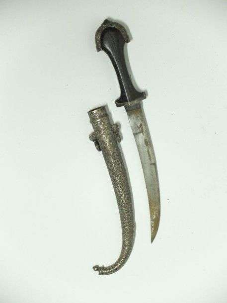 Poignard marocain, dit koumya. Poignée en bois. Monture en métal ciselé, argenté. Lame courbe. EM (fêle au bois)