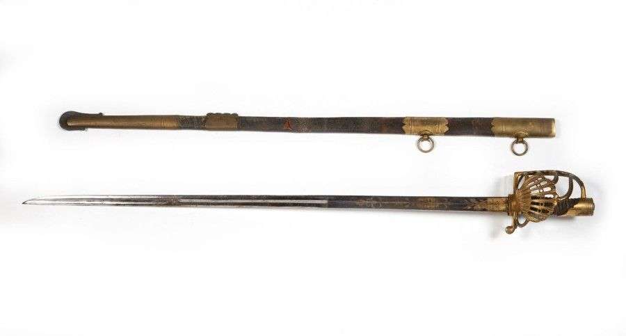 Sabre de Garde d'honneur Impériale de la ville de Strasbourg. Poignée recouverte de basane, avec filigrane. Monture en laiton, découpé, doré. Calotte à courte queue. Garde dit de bataille, à une branche principale, quatre secondaires et coquille ajourée. Lame droite, à dos plat, pointe dans le prolongement du dos et deux pans creux, gravée, dorée et bleuie au tiers, d'attributs militaires, aigle, faisceau de licteur et dans un médaillon « Garde d'honneur Impériale de la ville de Strasbourg ». Fourreau en cuir, à trois garnitures en laiton, découpé, décoré au trait, avec bague de renfort en laiton riveté. EM (piqûres, usures, accidents au cuir)