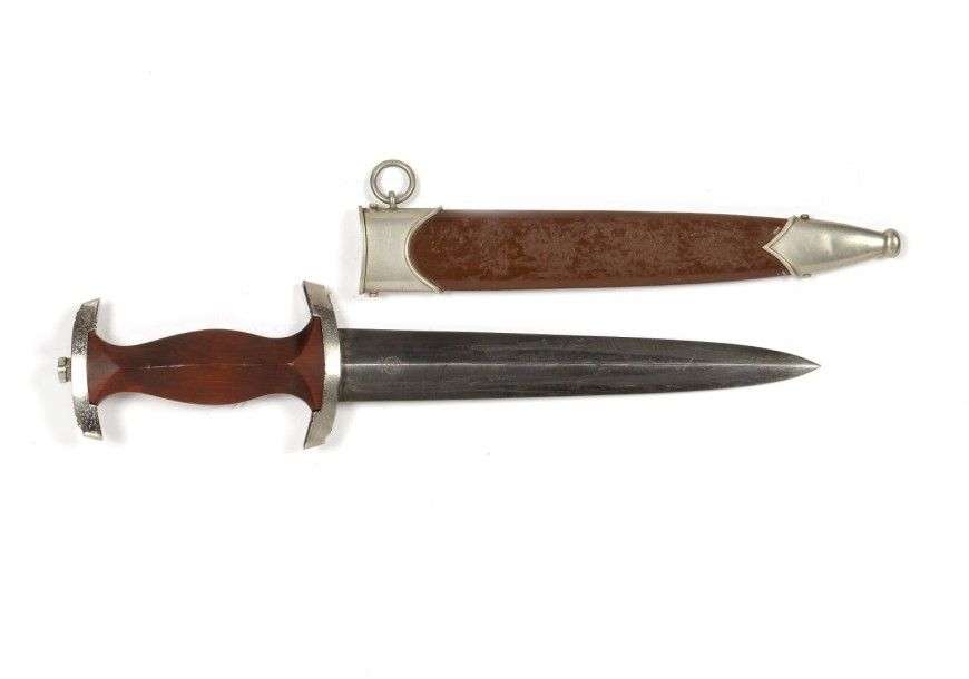 Dague, modèle 1933. Poignée et fourreau bruns. Lame avec devise, datée 194
