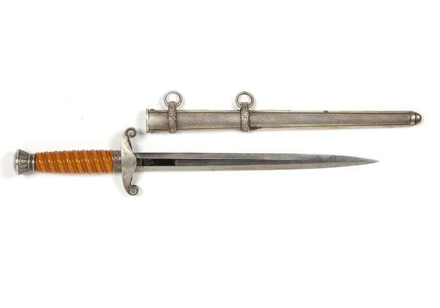 Dague d'Officier de l'Armée de Terre, modèle 1935. Fusée orange foncé. Lame à deux tranchants. Fourreau à deux bracelets. ABE Fabrication SMF Solingen.