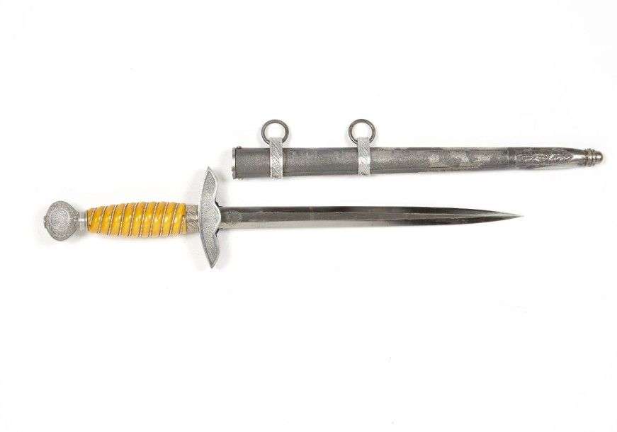 Dague d'Officier de l'Armée de l'Air, modèle 1937. Fusée orange, avec filigrane. Lame à deux tranchants. Fourreau à deux bracelets patiné. ABE Fabrication F.W. Höller Solingen.