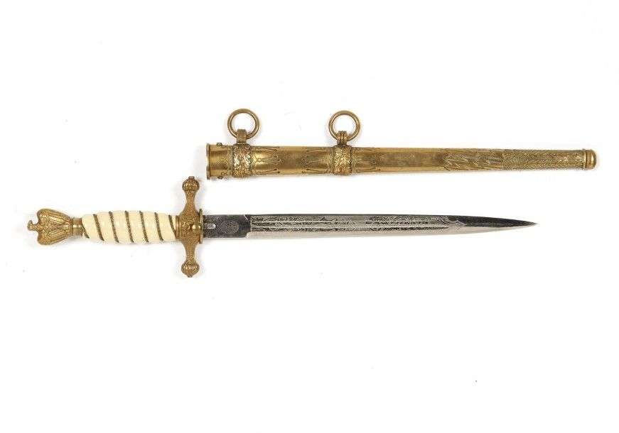 Dague d'Officier de Marine, modèle 1938. Fusée blanche, avec filigrane. Monture en laiton ciselé. Lame à deux tranchants et deux gouttières médianes, gravée. Fourreau à deux bracelets en laiton ciselé. BE Fabrication E & F Höller Solingen.