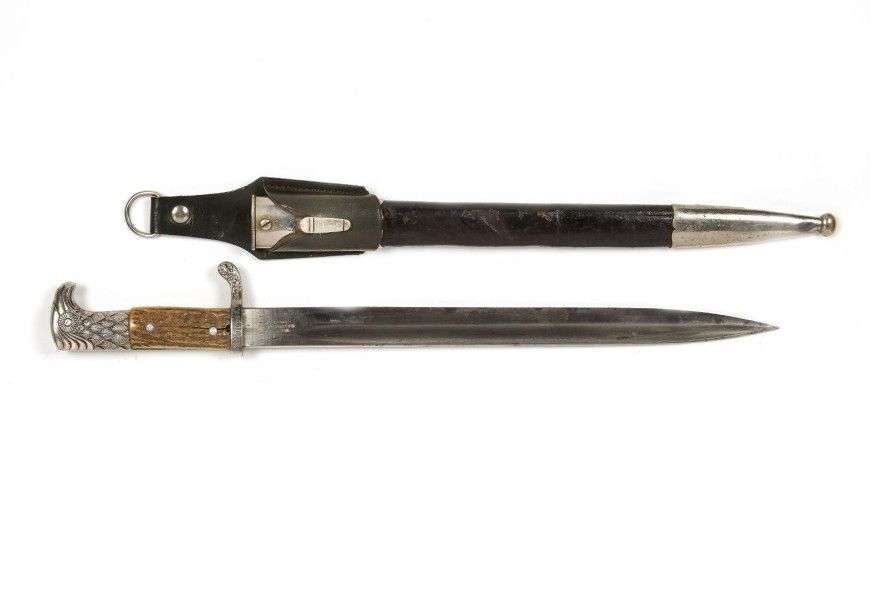 Baïonnette de la Police. Monture nickelée. Plaquette imitation de bois de cerf avec insigne. Quillons frappés « SB » et matricule. Fourreau en cuir, à deux garnitures nickelées. Avec un porte-fourreau en cuir vert. ABE Fabrication Weyersberg. (usure au porte-fourreau, lame tâchée, fêle à une plaquette)