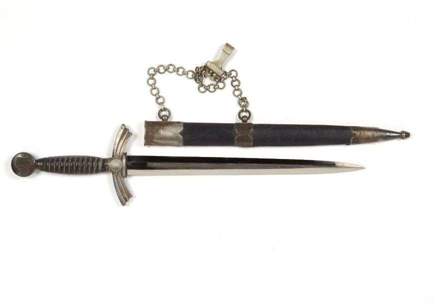 Dague d'Officier de l'Armée de l'Air, modèle 1935. Monture en métal argenté. Lame à deux tranchants. Fourreau recouvert de cuir, à trois garnitures en fer. Bélière en chaînettes. ABE Fabrication WMN.