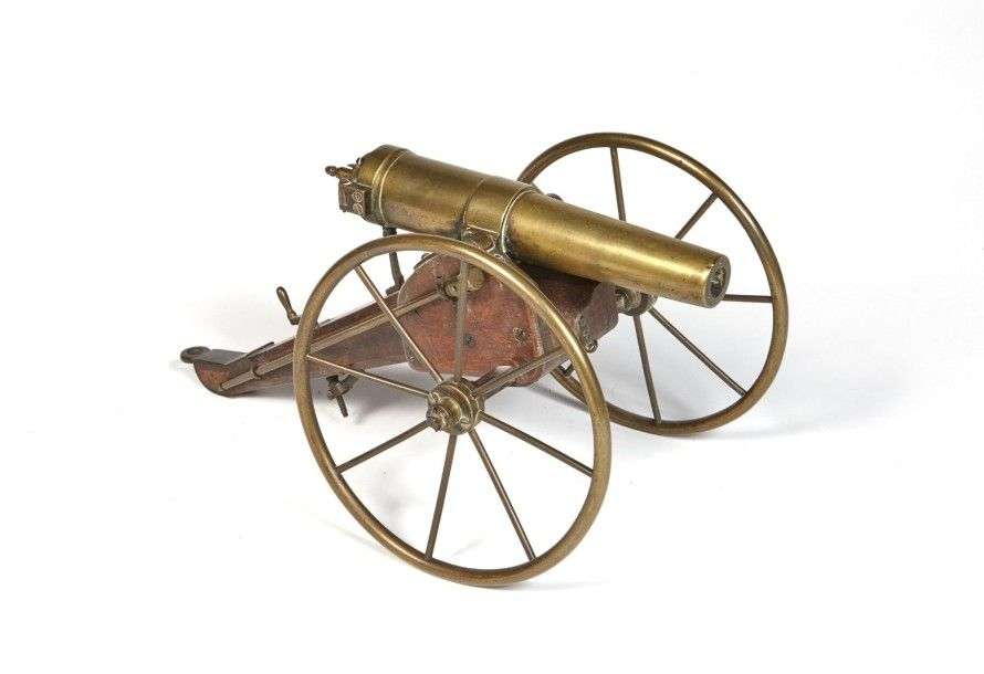 Maquette de canon, à chargement par la culasse. Fût rayé, culasse et roues à rayons en bronze. Affût en bois, à système d'élévation. Avec 2 baguettes de chargement. ABE L fût : 23 cm LT : 45 cm