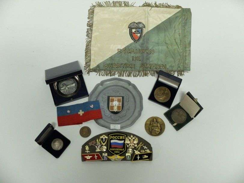 Lot : fanion du 14° RCTP Escadron de Quartier Général | coupelle souvenir BSL Rhône | médailles de table Ville de Nimes Féria, École des Beaux-arts | Aux maîtres d'Apprentissage et aux apprentis de l'Artisanat | Saint Bruno | Denis Papin | assiette en étain | brassard | bonnet de police soviétique avec insignes.