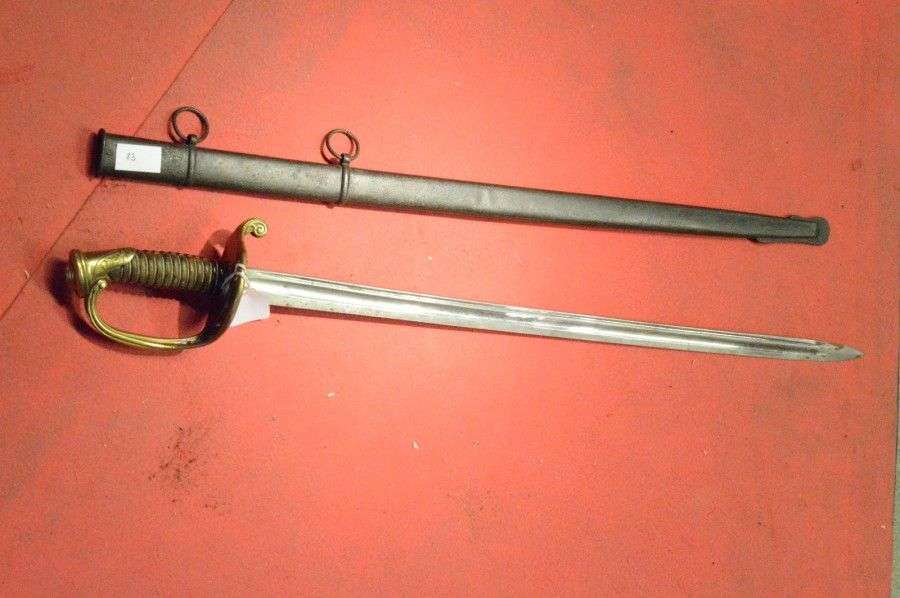 Sabre d'Officier d'Infanterie, modèle 1855. Poignée en corne. Monture en laiton, ciselé. Garde à une branche, à coquille ajourée. Lame courbe, à pans creux et gouttière. Fourreau à deux bracelets en fer. Dans l'état