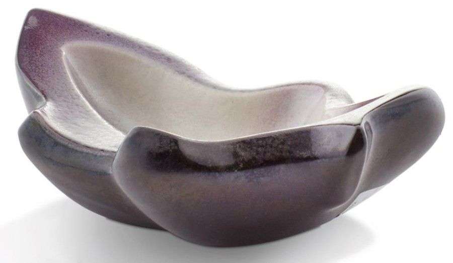 Vide-poche en faïence émaillée noire à nuance mauve et beige.