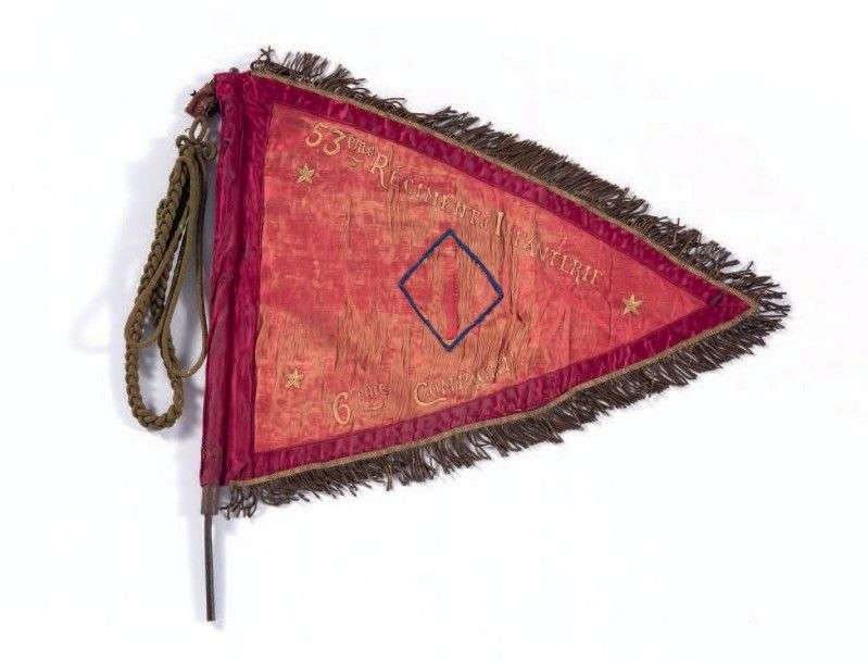 «53ème Régiment d'Infanterie, 6ème Cie» Fanion triangulaire, en soie violette, bordé de franges. Au verso, brodé de la Croix de guerre, à deux étoiles, grenades aux angles. Avec fourragère aux couleurs de la Croix de guerre et Croix de guerre. Hampe non réglementaire. EM vers 1920 Le Régiment est dissous en 1920. 43 x 55 cm(usures et manques)