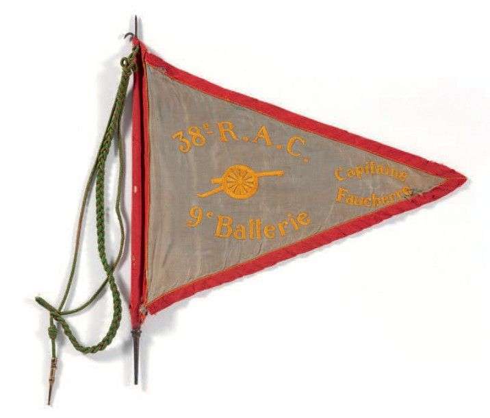 «38e R.A.C. 9e Batterie, Capitaine Faucherre» Fanion triangulaire, gris, bordé d'un galon écarlate. Au verso «Lorraine-Marne 1914, Verdun 1916-17, Bataille de la Libération, Champagne 1915, Ribécourt 1918». Avec fourragère aux couleurs de la Croix de guerre. Baïonnette, modèle 1886-93 montée en hampe. Vers 1918-1920 55 x 46 cm Garnison Nimes (trous et usures)