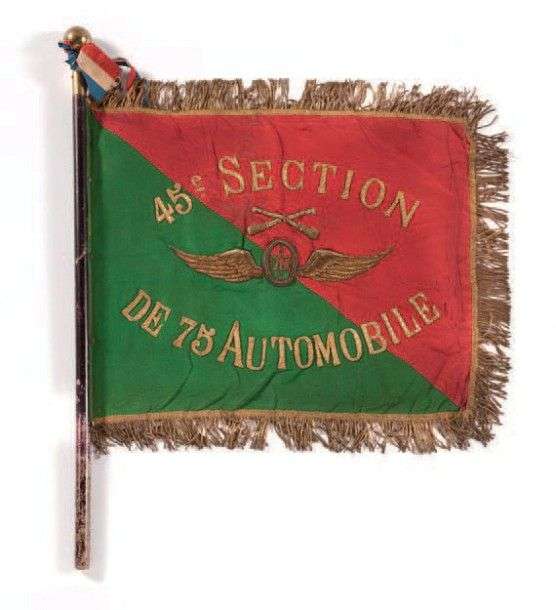 «45è Section de 75 Automobile» Fanion rectangulaire, rouge et vert, bordé de franges. Au verso uni. Hampe en bois, avec cravate tricolore.