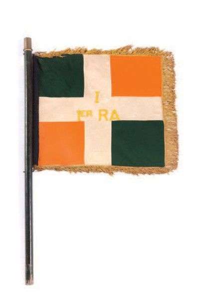 «I Ier RA» Fanion carré, bordé de franges. Les couleurs du verso sont celles de la batterie de réserve. 45 x 44 cm (l'emblème de la hampe est manquante)