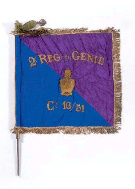 «2e Regt du Génie, Cie 16/51» Fanion carré, violet et bleu, bordé de franges dorées. Unie sur l'autre face. Hampe en bois, surmontée d'une pique, avec Croix de guerre. 50 x 48 cm (manque la pique) Période entre deux guerres. Compagnie divisionnaire ayant combattue sur le front français.