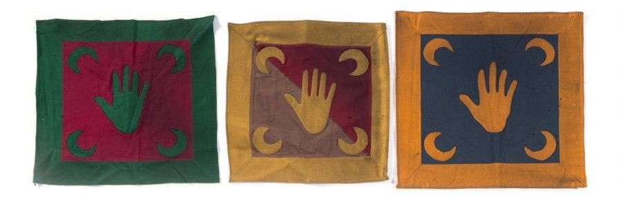 Lot de 3 fanions rectangulaires, de Tirailleurs algériens, fabrication locale. 46 x 42 cm (usures, salissures, traces d'insectes)