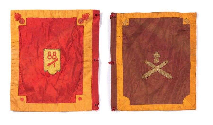 Lot de 2 fanions rectangulaires, du 88e Régiment d'Artillerie 1ère Batteri