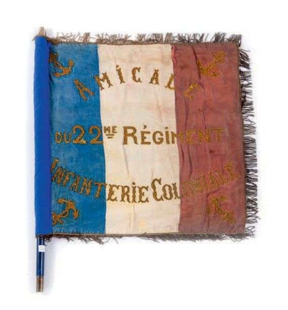 «Amicale du 22e Régiment d'Infanterie Coloniale» Drapeau tricolore, bordé de franges dorées, brodé sur l'autre face «Indochine 1854 1885, Beauséjour 1915, Somme 1916, Aisne-Reims 1917-18, La Somme 1940». Au angles de l'ancre de marine. 80 x 75 cm (usures, partie du fourreau postérieure)