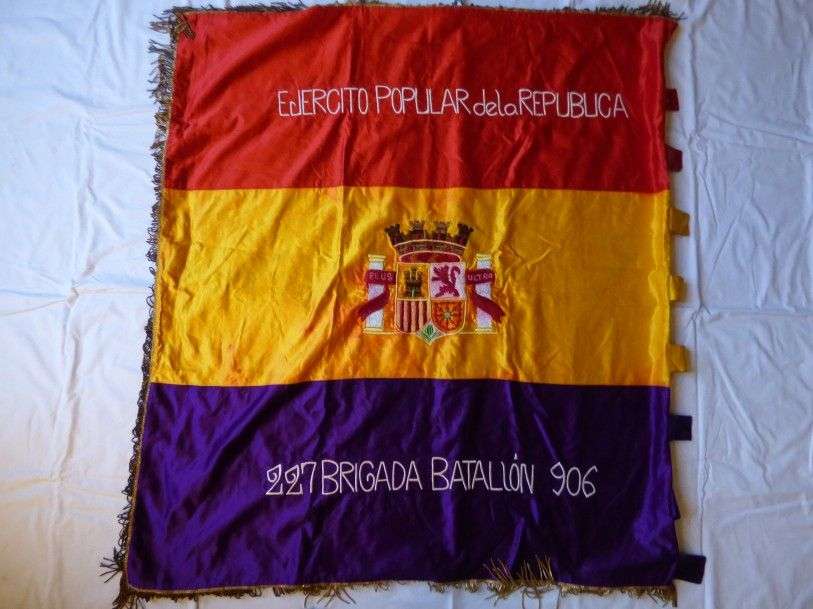 «Ejercito popular de la Republica, 227 Brigada Batallon 906» Drapeau espagnol, tricolore, brodé au centre les Armes d'Espagne sous couronne murale. 115 x 101 cm (traces d'humidité sur le pourtour)